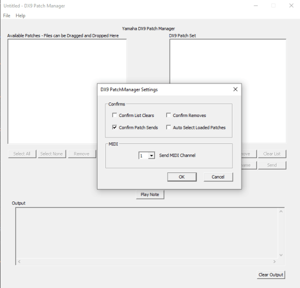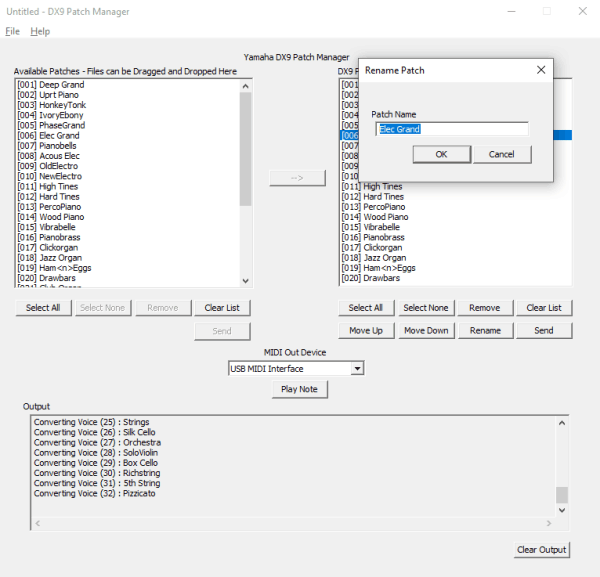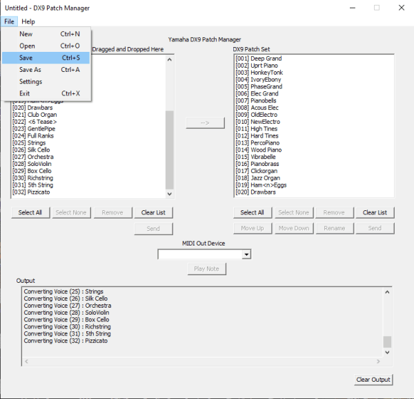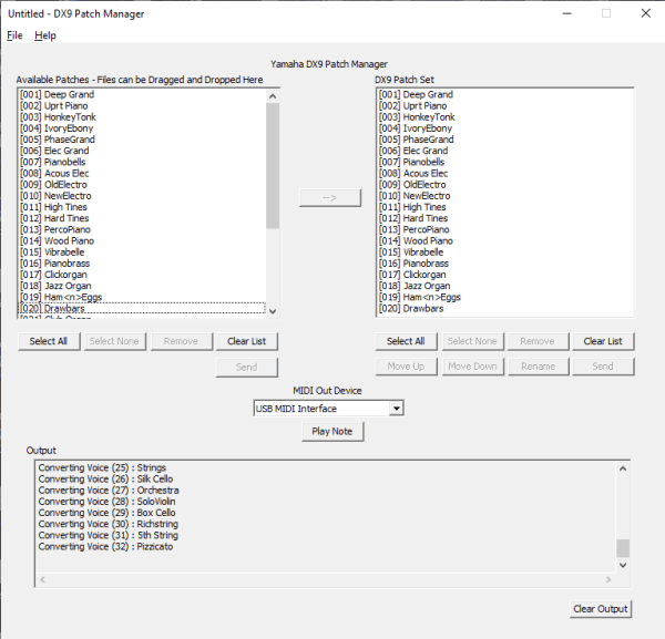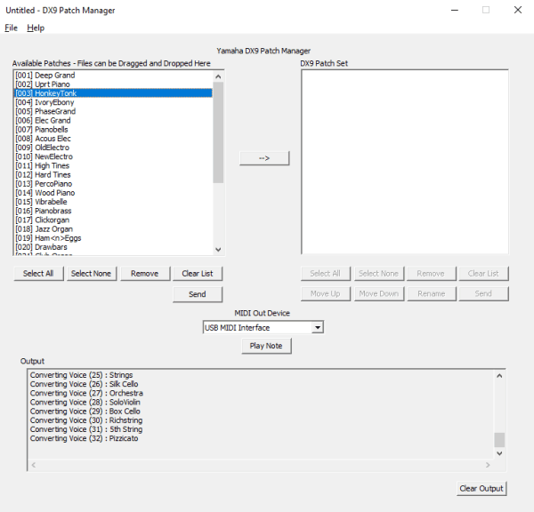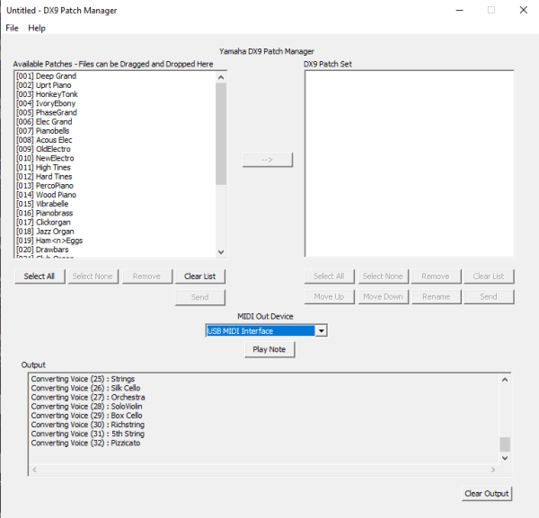 You can audition patches from either list, select the patch (or patches) you want to audition and press the "Send" button below the appropriate list. This will send the patch data over MIDI to your DX9 (you will need a USB to MIDI interface for this). If you have selected a single patch it will appear in the DX9's edit buffer, if you select 2 or more patches a bulk message will be sent and all 20 patches on your DX9 will be replaced.
